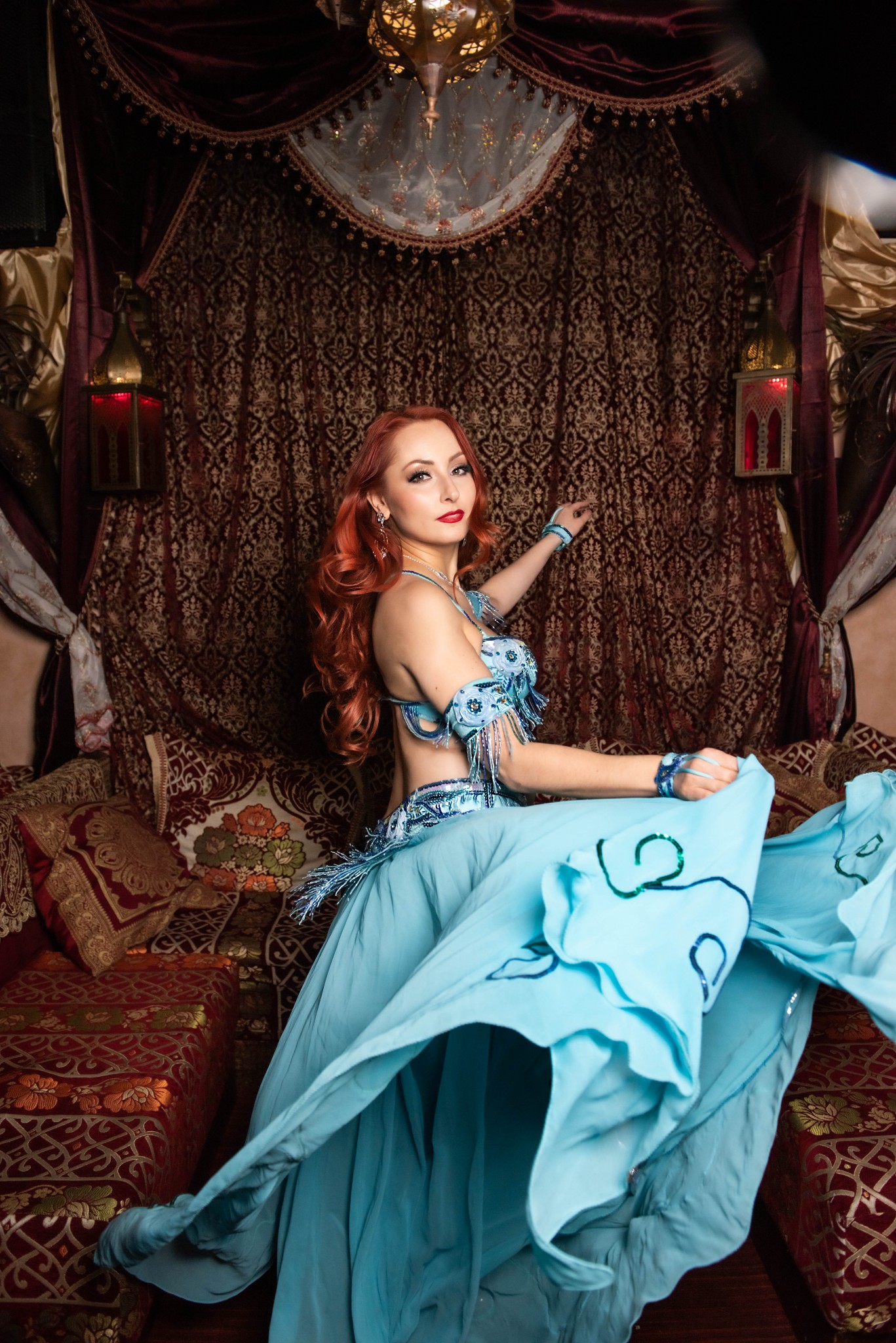 Use of multiple props such as veils, wings, or finger cymbals to enhance the performance