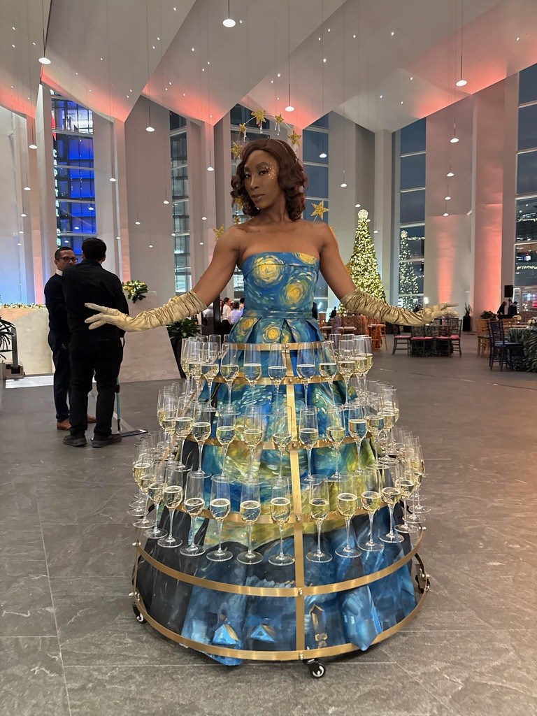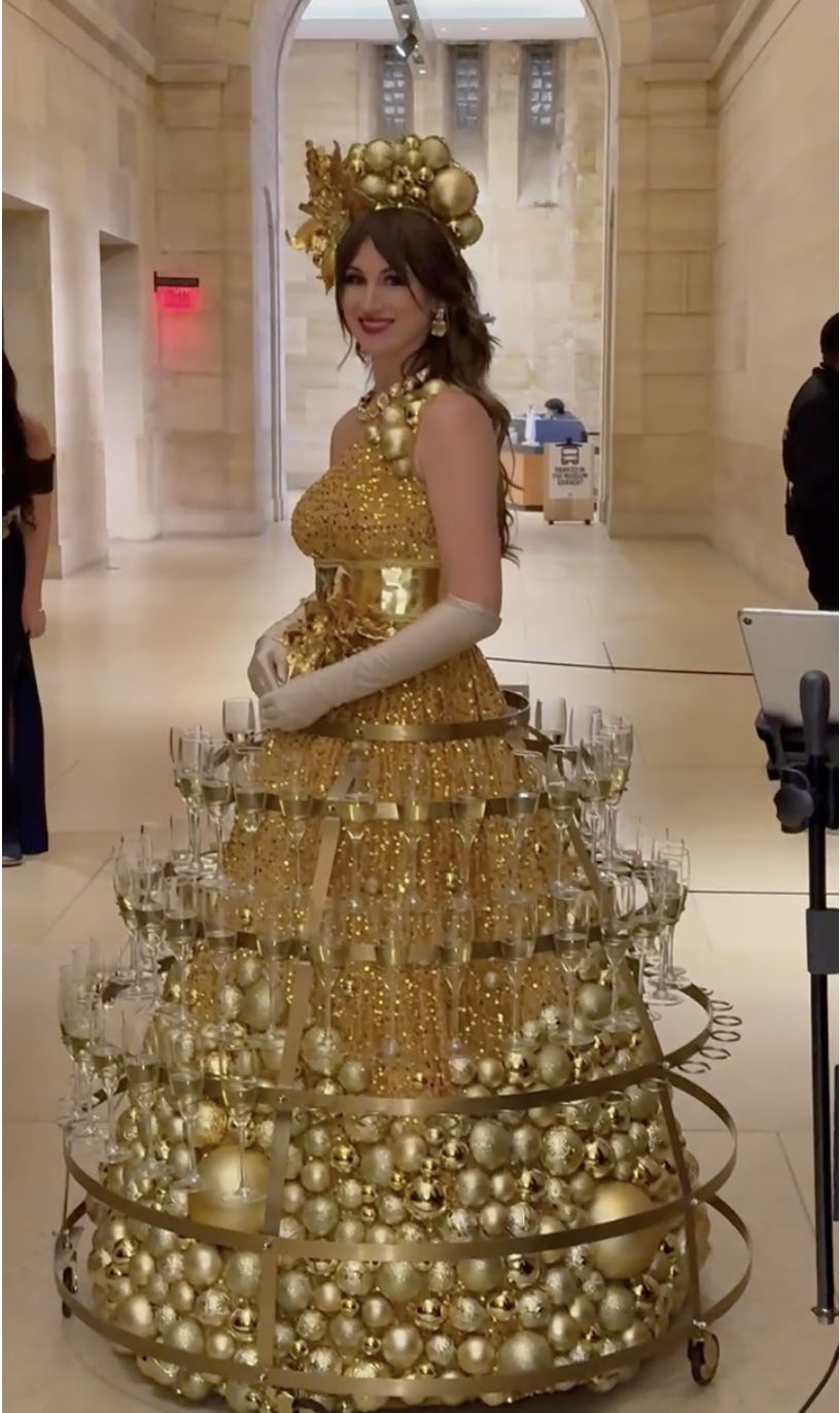 Our champagne skirt performer wears a stunning oversized skirt filled with champagne or sparkling cider, elegantly serving guests as she mingles through the event.